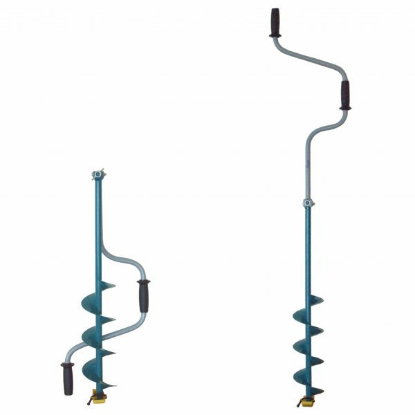 Основное и единственное отличие двуручных ледобуров от классических – верхняя рукоятка ледобура смещена относительно оси ледобура на 130 мм, а нижняя на 150 мм. Такое расположение рукояток позволяет вращать ледобур одновременно двумя руками, тем самым, увеличивая скорость бурения лунок во льду. Кроме того, существенно уменьшаются габариты ледобура в транспортном положении. По всем остальным характеристикам двуручные ледобуры полностью соответствуют классическим.